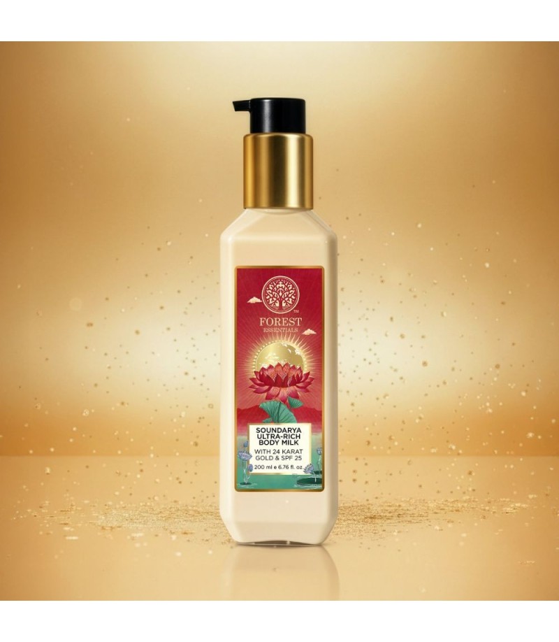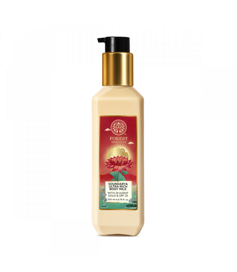 The Ultra-Rich Body Milk Soundarya is enriched with burnt Cane Sugar, a natural humectant which attract and seal moisture into the skin. It is made with the most precious ingredients, including the path breaking Soundarya Serum and Ayurvedic Natural Mineral Zinc SPF 25. The 24 Karat Gold Bhasma has the property of penetrating to the deepest layer of skin, providing radiance and increased elasticity.