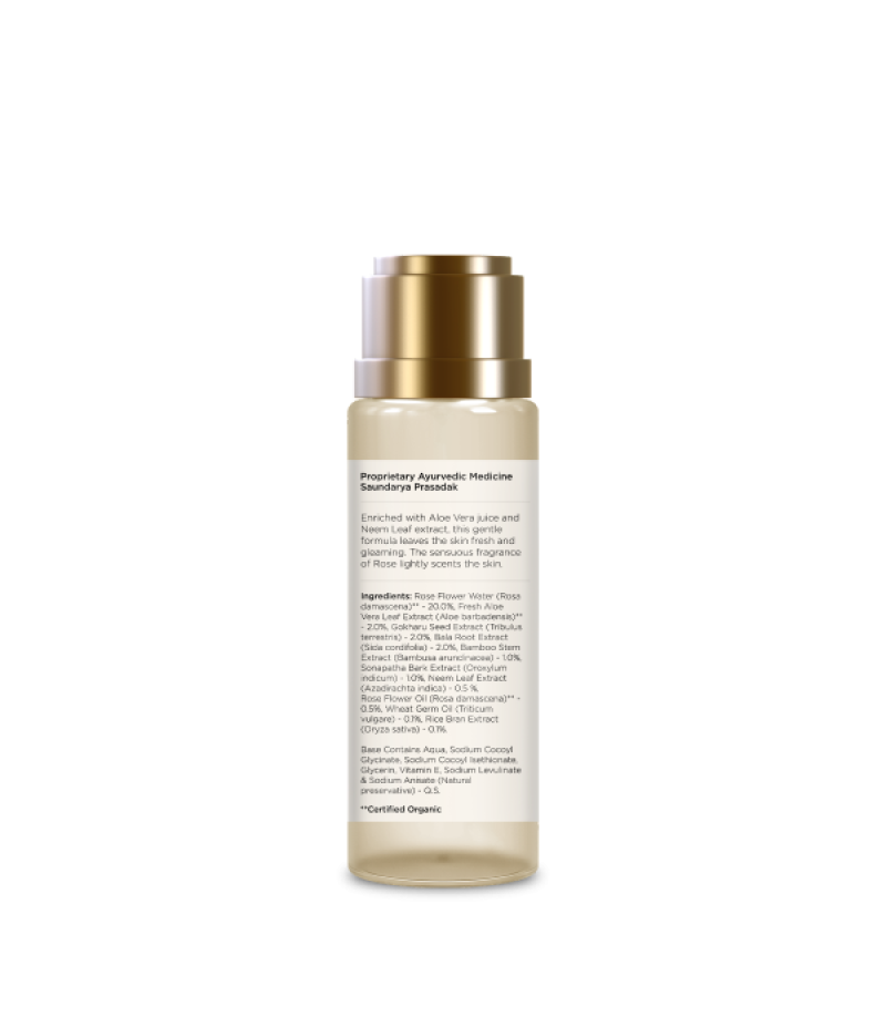 Rose Water (Rosa Damascena)** - 20.0%, Fresh Aloe Vera Leaf Extract (Aloe Barbadensis)** - 2.0%, Gokharu Seed Extract (Tribulus Terrestris) - 2.0%, Bala Root Extract (Sida Cordifolia) - 2.0%, Vansh Extract (Bambusa Arundinacea) - 1.0%,Sonapatha Bark Extract (Oroxylum Indicum) -1.0%, Neem Leaf Extract (Azadirachta Indica) -0.5 %, Rose Flower Oil (Rosa Damascena)** -0.5%, Wheat Germ Extract (Triticum Vulgare) -0.1%, Rice Extract (Oryza Sativa) - 0.1%. Base Contains Aqua, Glycerin, Sodium Cocoyl Glycinate, Sodium Cocoyl Isothionate, Guar Hydroxypropyl Trimonium Chloride, Vitamin E(Tocopheryl Acetate)**, Ethylhexylglycerin